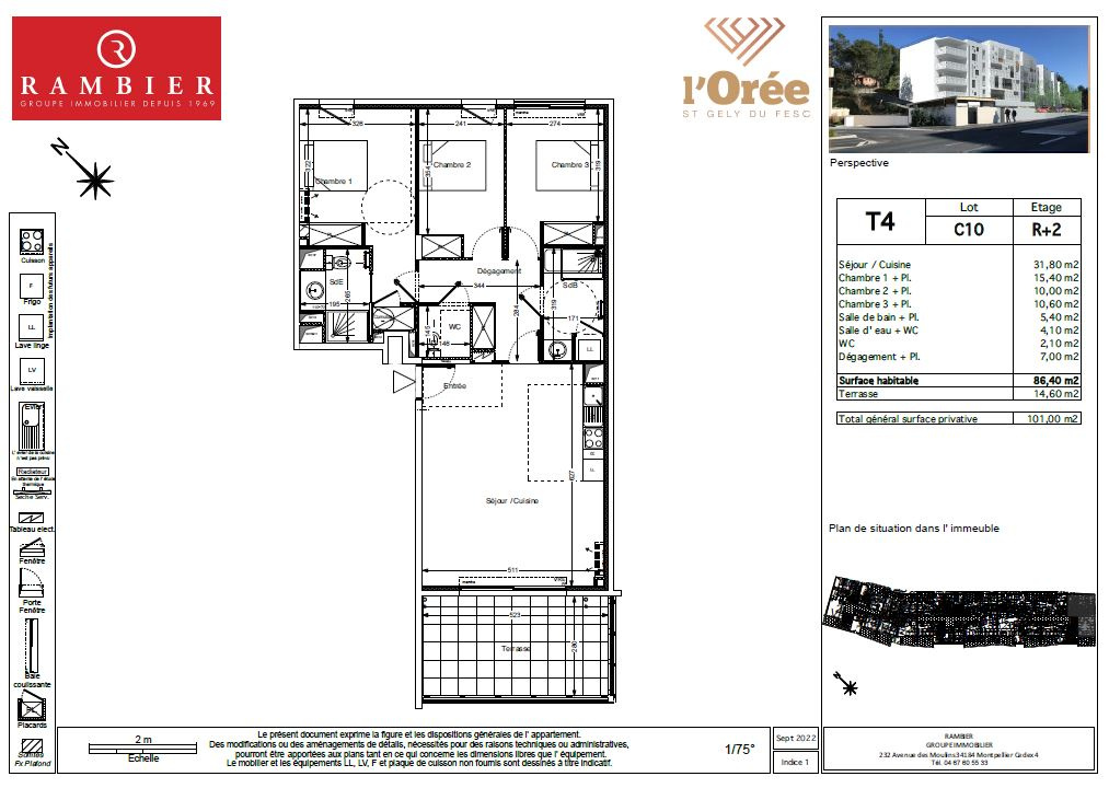 Un appartement de type T4, de 86m2, au niveau R+2 du bâtiment C, cage d’escalier C, portant le numéro commercial C10, et comprenant : une entrée, un séjour/cuisine, 3 chambres, une salle de bains, une salle d’eau avec WC, un WC, un dégagement et une terrasse de 14 m2.