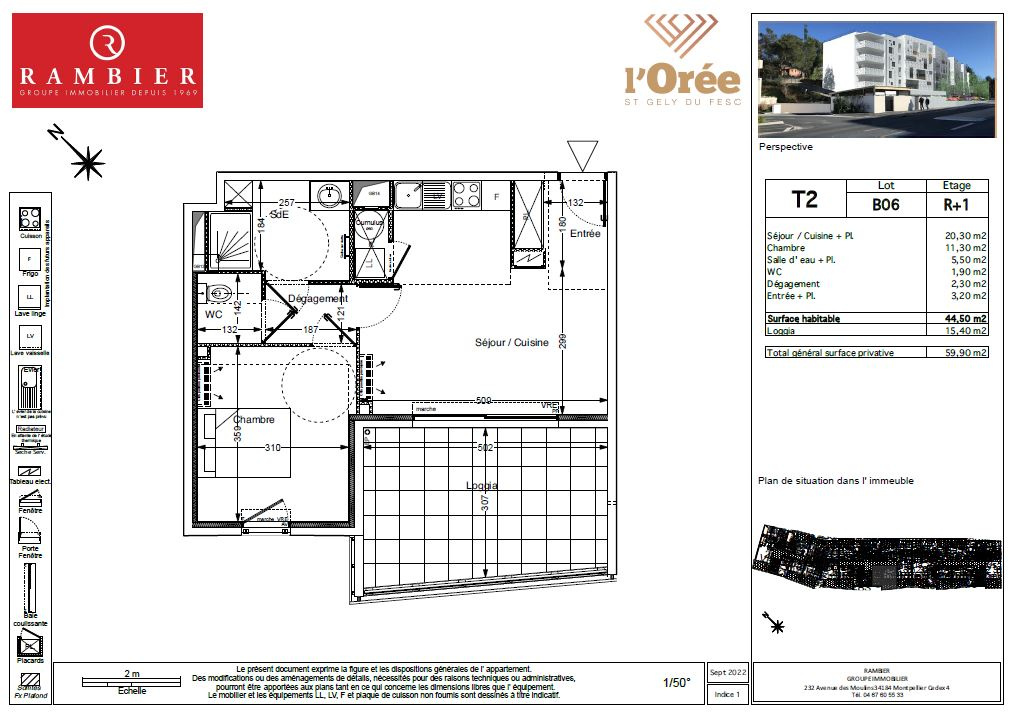 Un appartement de type T2, de 44 m2, au niveau R+1 du bâtiment B, cage d’escalier B, portant le numéro commercial B06, et comprenant : une entrée, un séjour/cuisine, une chambre, une salle d’eau, un WC, un dégagement et une loggia de 15 m2.
