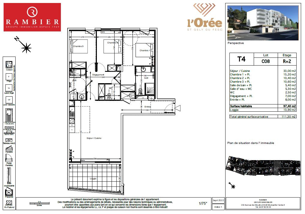 Un appartement de type T4, de 97 m2, au niveau R+2 du bâtiment C, cage d’escalier C, portant le numéro commercial C08, et comprenant : une entrée, un séjour/cuisine, 3 chambres, une salle de bains, une salle d’eau avec WC, un WC, un dégagement et une loggia de 13 m2.